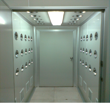 風淋室根據(jù)吹淋方式可分為:頂吹風淋室、單人單吹風淋室、單人雙吹風淋室、單人三吹風淋室、雙人雙吹風淋室、雙人三吹風淋室、多人雙吹風淋室、多人三吹風淋室、轉(zhuǎn)角風淋室。