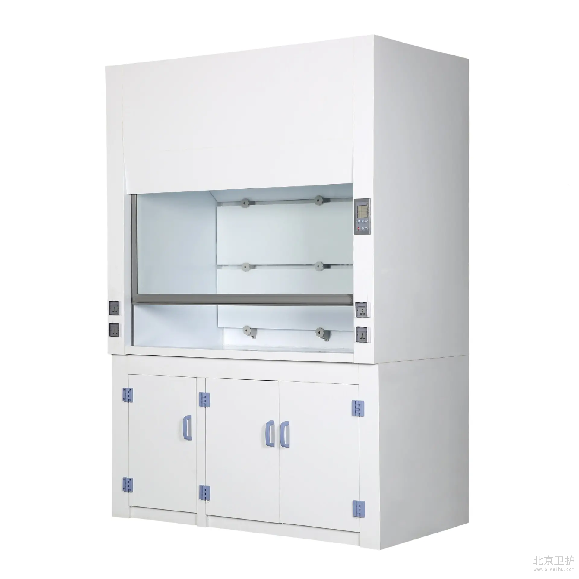 通風(fēng)柜是實(shí)驗(yàn)室家具中必不可少的一種。在實(shí)驗(yàn)室中起到排風(fēng)和換氣的功效。通風(fēng)柜的結(jié)構(gòu)是上下式,其頂部有排氣孔,可安裝風(fēng)機(jī)。上柜中有導(dǎo)流板,電路控制觸摸開關(guān),電源插座等 ,透視窗采用鋼化玻璃,可左右或上下移動(dòng)。供人操作。下柜采用實(shí)驗(yàn)邊臺(tái)樣式,上面有臺(tái)面,下面是柜體。臺(tái)面可安裝小水杯和龍頭。通風(fēng)柜的材料由多種的,全鋼、鋼木、全木、鋁木、塑鋼、PVC結(jié)構(gòu)等,其臺(tái)面是直接與操作者接觸的地方,由實(shí)芯理化板,不銹鋼板,PVC,陶瓷等材料組成。舊式通風(fēng)柜多用木材制成,但現(xiàn)代多為涂有環(huán)氧樹脂的鋼材制造。常見柜寬為1000、1200、1500、1800和2000毫米幾個(gè)規(guī)格,深700-900毫米,高1900-2400毫米。可供1-3個(gè)人同時(shí)使用。 通風(fēng)柜一般靠墻安裝。前方中間為可上下移動(dòng)的透明門(多為玻璃),開啟高度一般為100-600毫米。門后為實(shí)驗(yàn)進(jìn)行的工作面,有水管、下水道、電源、真空泵、氣路管線等實(shí)驗(yàn)需要的連接,上有帶保護(hù)罩的燈照明。空氣由柜內(nèi)前上方的排風(fēng)扇抽走后,或經(jīng)管道引到別處(稱為全通風(fēng)),或經(jīng)過濾重新循環(huán)使用(成為無管通風(fēng))。多數(shù)通風(fēng)柜在(1)排氣量過小(2)前方玻璃門開啟過大的時(shí)候會(huì)發(fā)出警報(bào),提醒操作者注意,一般玻璃門開啟后操作口風(fēng)速不應(yīng)低于0.5m/s,內(nèi)部的排風(fēng)扇速度和燈都有開關(guān)可調(diào)。使用的時(shí)候人站或坐于柜前,將玻璃門盡量放低,手通過門下伸進(jìn)柜內(nèi)進(jìn)行實(shí)驗(yàn)。由于排風(fēng)扇通過開啟的門向內(nèi)抽氣,在正常情況下有害氣體不會(huì)大量溢出。